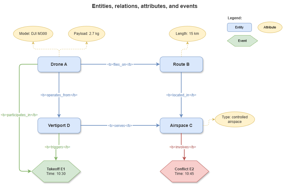 UAV-A102, airspace gridGrid-3A, vertiportVertiport-X.Relation: A semantic link between entities—a directed edge—e.g.