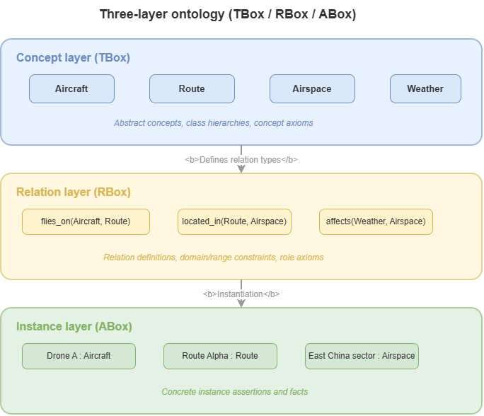 Aircraftparent ofUAVandManned_Aircraft.Relation layer: Legitimate links between concepts—object properties (entity–entity) and data properties (entity–literal). Each relation needs clear domain and range—e.g.