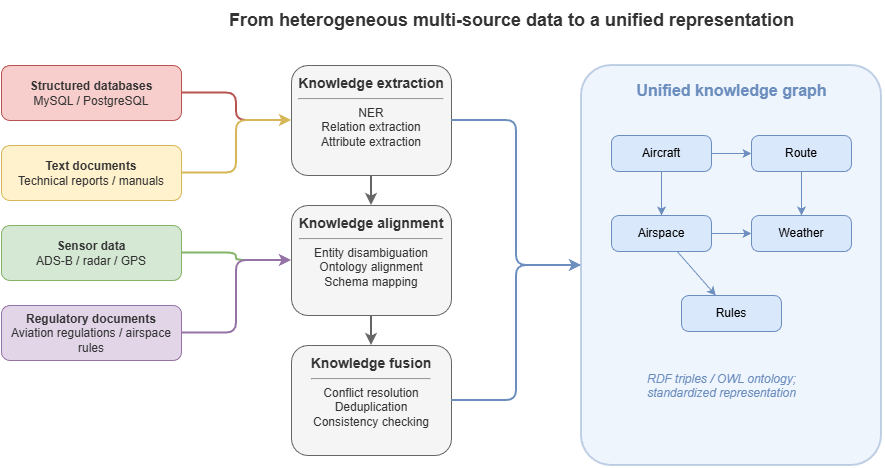 City-scale low-altitude governance ingests fragmented sources: ADS-B trajectories, radar point clouds, structured flight plans, semi-structured METAR-style messages, unstructured policy text. Unification requires information extraction and knowledge fusion: