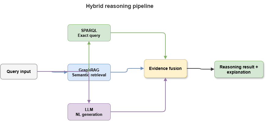 Structurally, SPARQL anchors facts; LLMs organize language under evidence; RAG/GraphRAG widen retrieval; solvers own formal tests—chained into a traceable pipeline.
