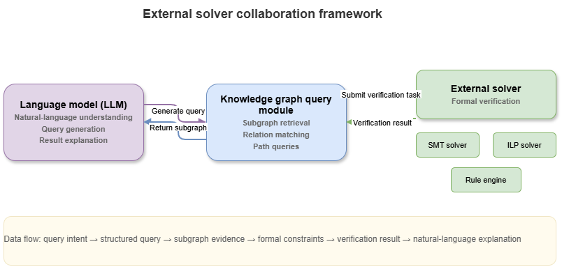 Even with KGs, SPARQL, and GraphRAG, tasks needing explicit rule checking, consistency, constraint satisfaction, or combinatorial search still require external solvers—rule engines, DL reasoners, constraint/SAT/SMT solvers, planners, graph searchers, domain modules. LLMs excel at NL understanding, context weaving, and explanation; solvers excel at verifiable feasibility and violation checks.