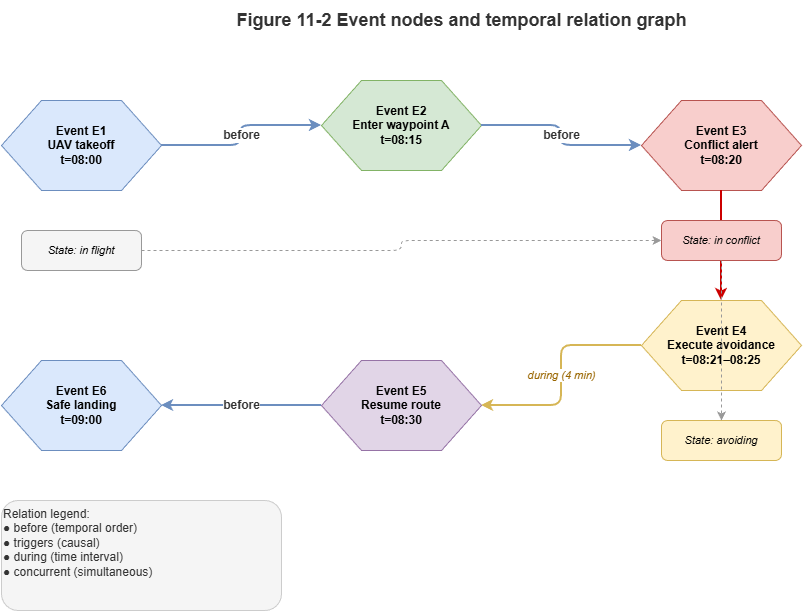 UAV transitioning from a normal corridor to an emergency detour corridor—time slices for aircraft, corridor state, and applicable rules, showing state transitions, event triggers, and traceability.
