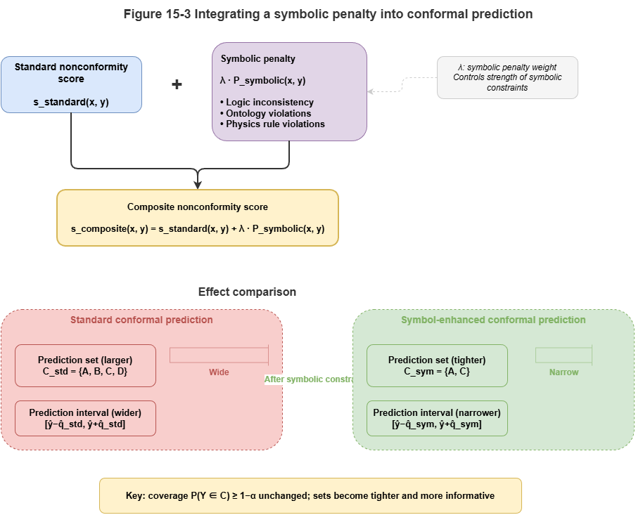 Here \(s_{neural}\) measures neural uncertainty; \(P_{symbolic}\) is large if candidate \(y\) violates hard physical rules or high-priority regulations in the graph (e.g., trajectory through a no-fly zone). Predictions that grossly violate domain knowledge are pushed out of the conformal set.