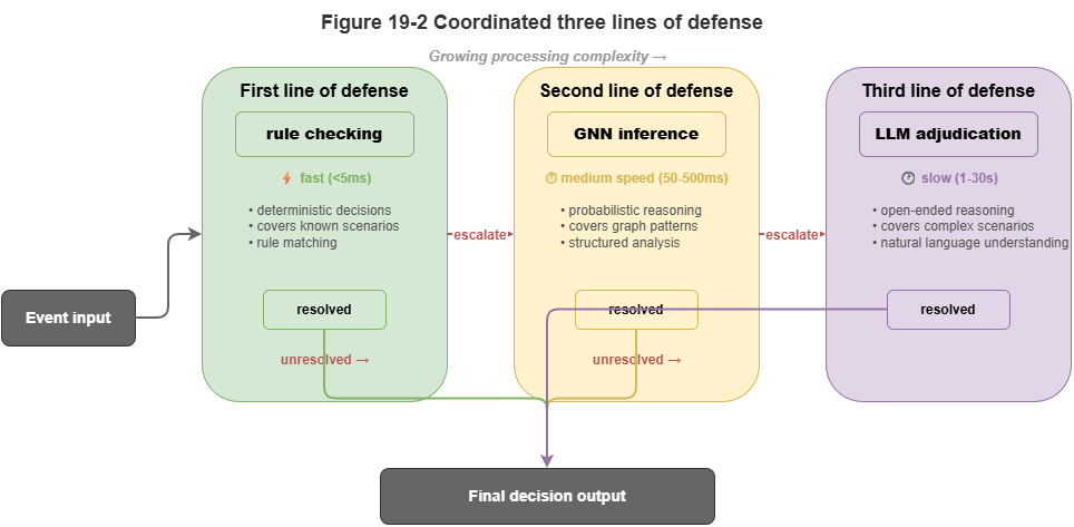 Figure 19-2: Three-line defense—rules, GNN, LLM.