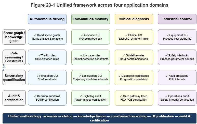 In earlier chapters we used urban low-altitude traffic (UAM) as the main thread to build and validate a neuro-symbolic reasoning stack. The hybrid paradigm of “perceive–know–reason–decide,” and its trustworthy certification mechanisms, are not unique to low-altitude operations. Wherever error tolerance is vanishingly small, physical laws bite hard, and expert knowledge dominates, purely data-driven models hit a deployment wall.