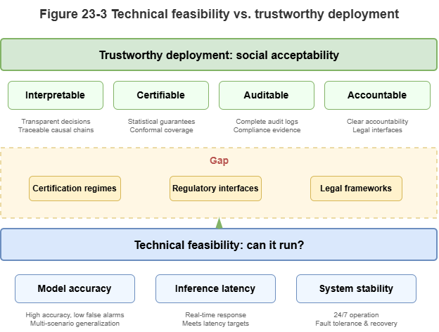 Trustable: Clear operational design domain (ODD); on unknown or extreme long-tail inputs, calibrated uncertainty and graceful degradation; tamper-resistant audit logs and causal explanations for critical decisions; core logic certifiable to aviation or automotive standards (e.g., DO-178C, ISO 26262).