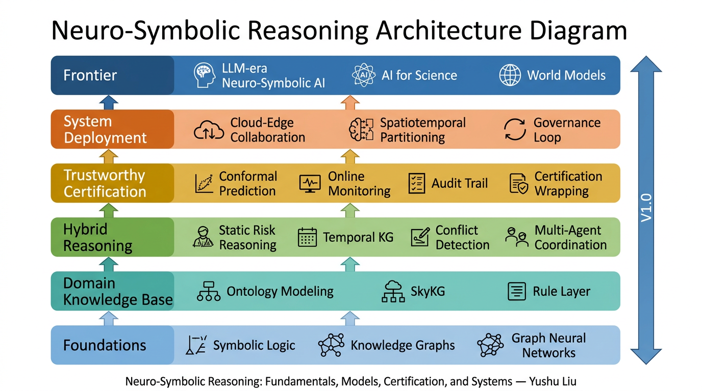 It covers 25 chapters across six layers, from symbolic logic and knowledge graphs all the way to cloud-edge deployment and LLM-era agents. Urban air mobility (UAM) is the primary scenario, but the methodology applies broadly to autonomous driving, medical AI, industrial control, and AI for Science.
